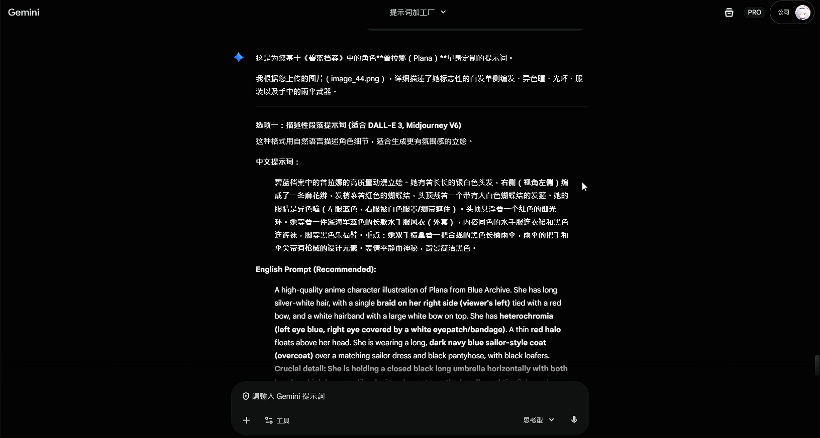 写出一段碧蓝档案普拉娜的提示词 (可以上传图片给Gemini参考,这就是它和其它AI区别最大的地方,能够减少思考的时间)